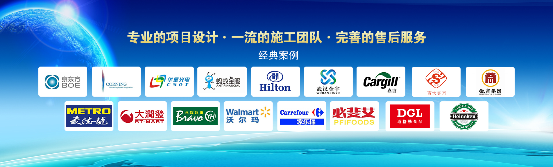 冷凍冷藏設(shè)備大型冷庫項(xiàng)目: 武漢中百物流冷庫(40000㎡)、蘇州、北京普洛斯大型物流庫(17000㎡)、沈陽佳德物流冷庫(20000㎡)、上海東航配餐物流庫(6000㎡)、杭州華商勾莊物流冷庫(24000㎡)、安徽安心蔬菜綠色食品冷庫(12000㎡)、武漢金宇冷庫(35000㎡)、必斐艾食品廠(14000㎡)、中國-東盟(百色)農(nóng)產(chǎn)品交易中心冷庫物流工程(30000㎡)、遵鐵物流冷鏈物流區(qū)建設(shè)項(xiàng)目中心冷庫物流工程(16500㎡)、長沙云冷產(chǎn)業(yè)園冷庫物流工程(21000㎡)等;大型中央空調(diào)項(xiàng)目: 武漢康寧顯示玻璃廠廠房、武漢京東方模組廠房、武漢華星光電模組廠房、深圳華星光電模組廠房,杭州阿里巴巴辦公樓,舟山波音737機(jī)場辦公樓,南京江北能源站、上海金融大酒店等